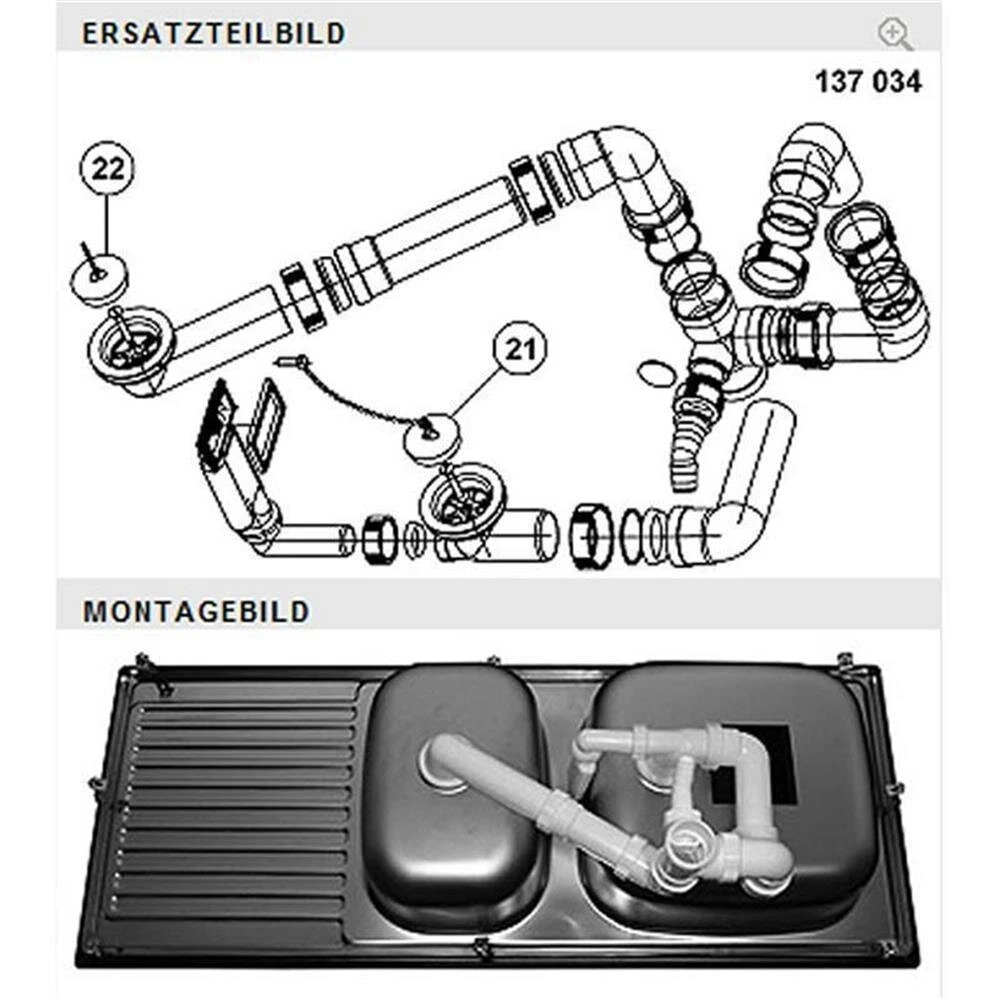 an den Abfluss (Geruchverschluss bzw. Siphon). Für Zwei-Becken-Spülen reversibel