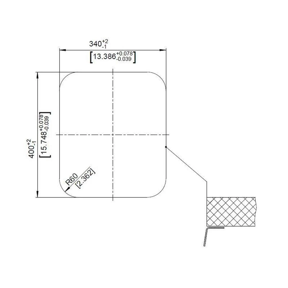 - Ausschnittmaße: 340 x 400 mm, Ecken R=60 mm