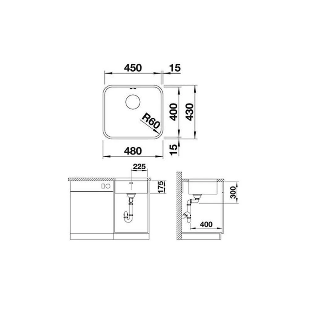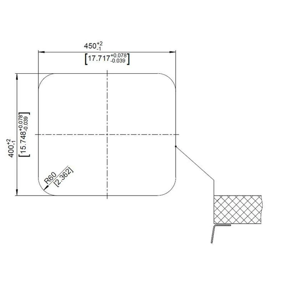 - Ausschnittmaße: 450 x 400 mm, Ecken R=60 mm