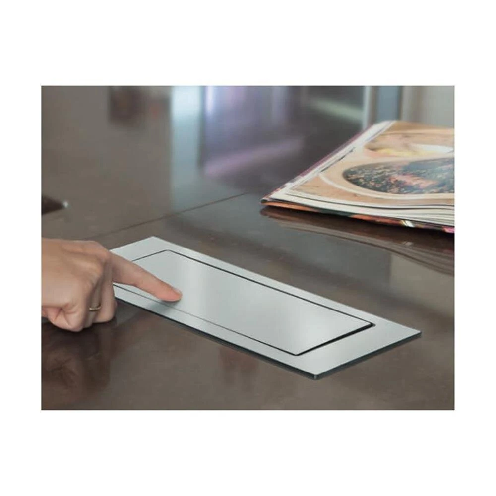 Geschlossen ist Evoline BackFlip nur eine dünne Platte auf der Arbeitsfläche. Mit einem Finger angetippt dreht er sich um 180 Grad und zeigt seine nützliche Seite: USB-Charger und Steckdose liegen so hoch über die Platte, dass sie vor Wasser geschützt sind.