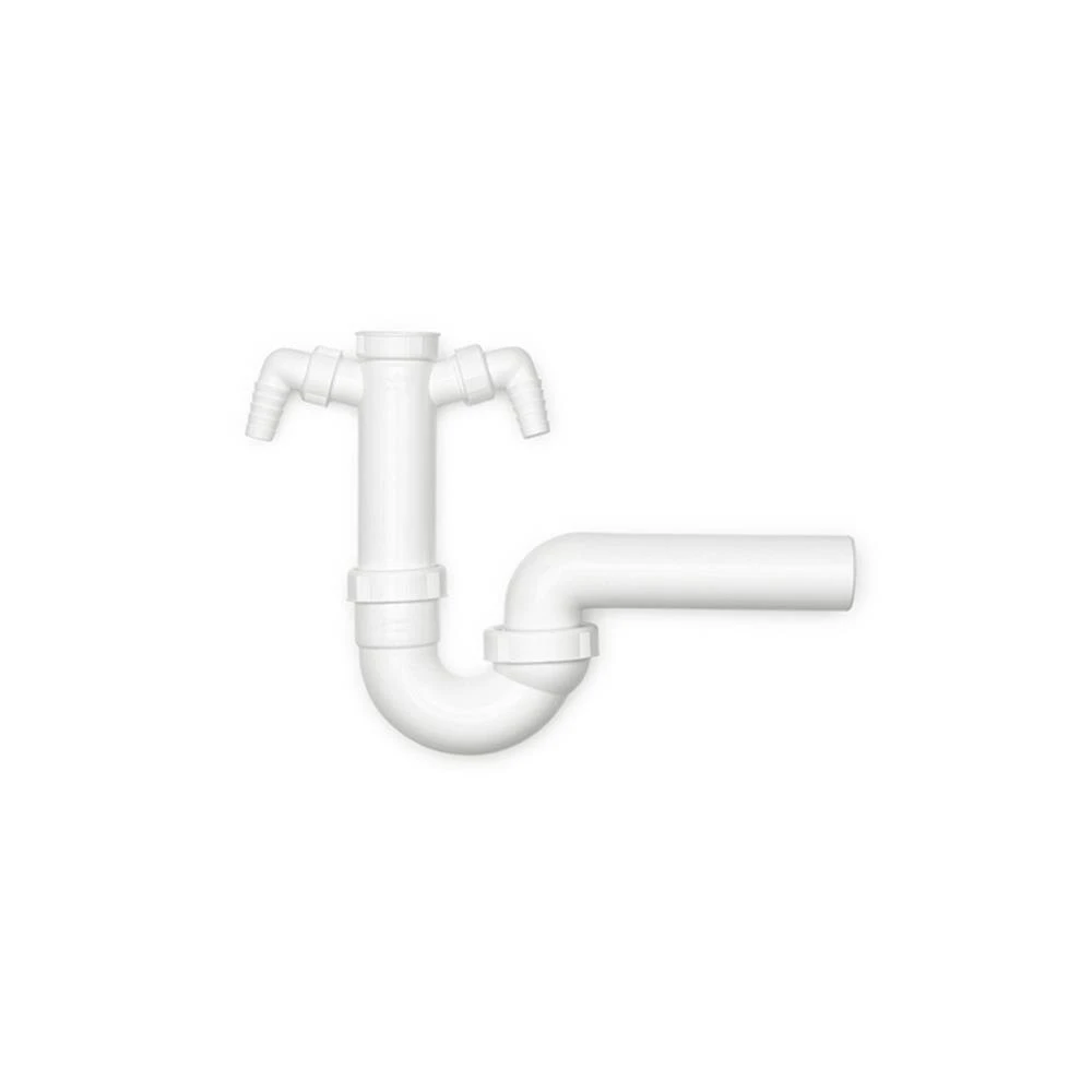 Der Abgang ist durch ein Kugelgelenk höhen- und tiefenvariabel und lässt sich deshalb auch auf engem Raum optimal mit den Entsorgungsanschlüssen verbinden. Zusätzlich 2 Winkeltüllen für Abwasseranschluss eines Geschirrspülers und einer Waschmaschine, geprüft nach DIN EN274