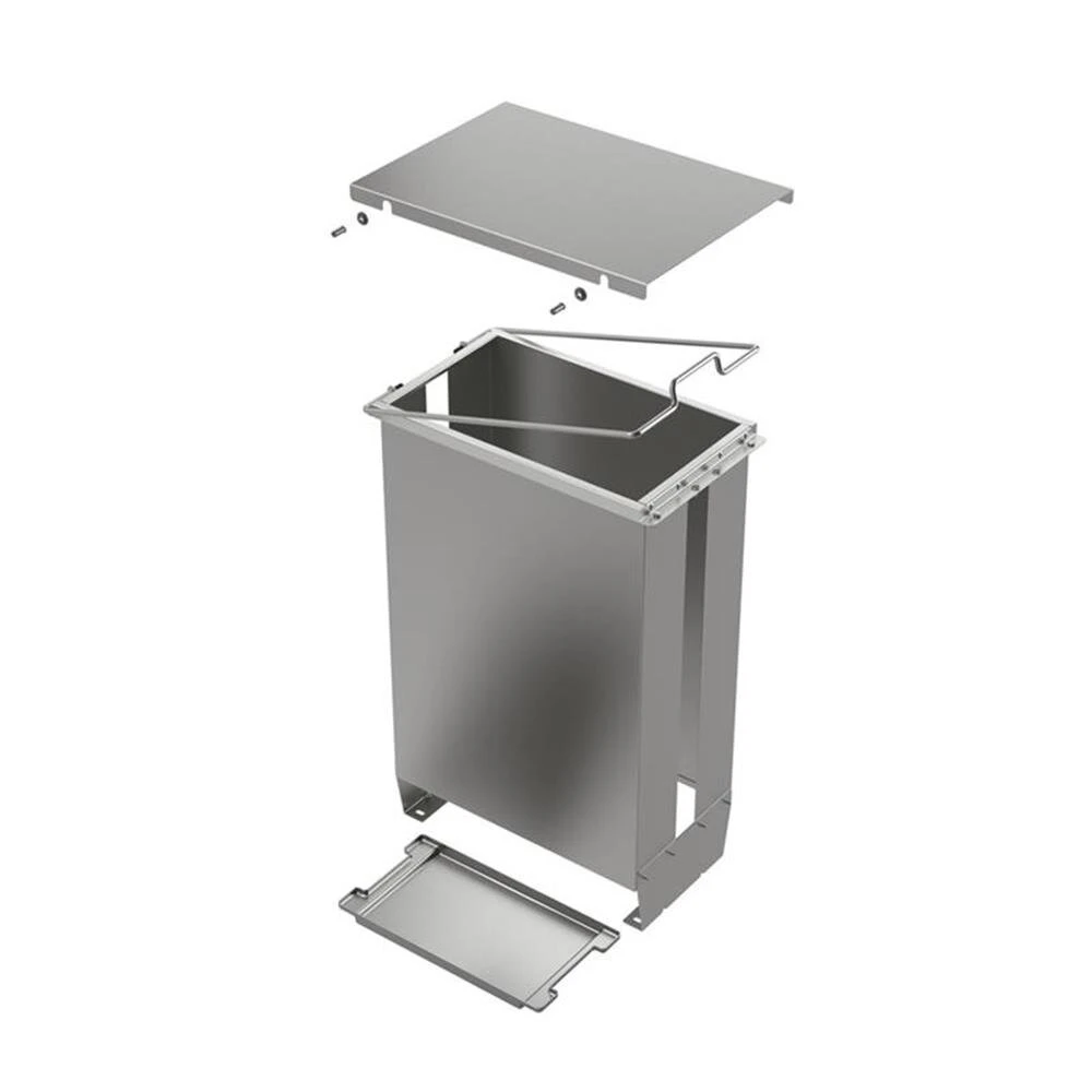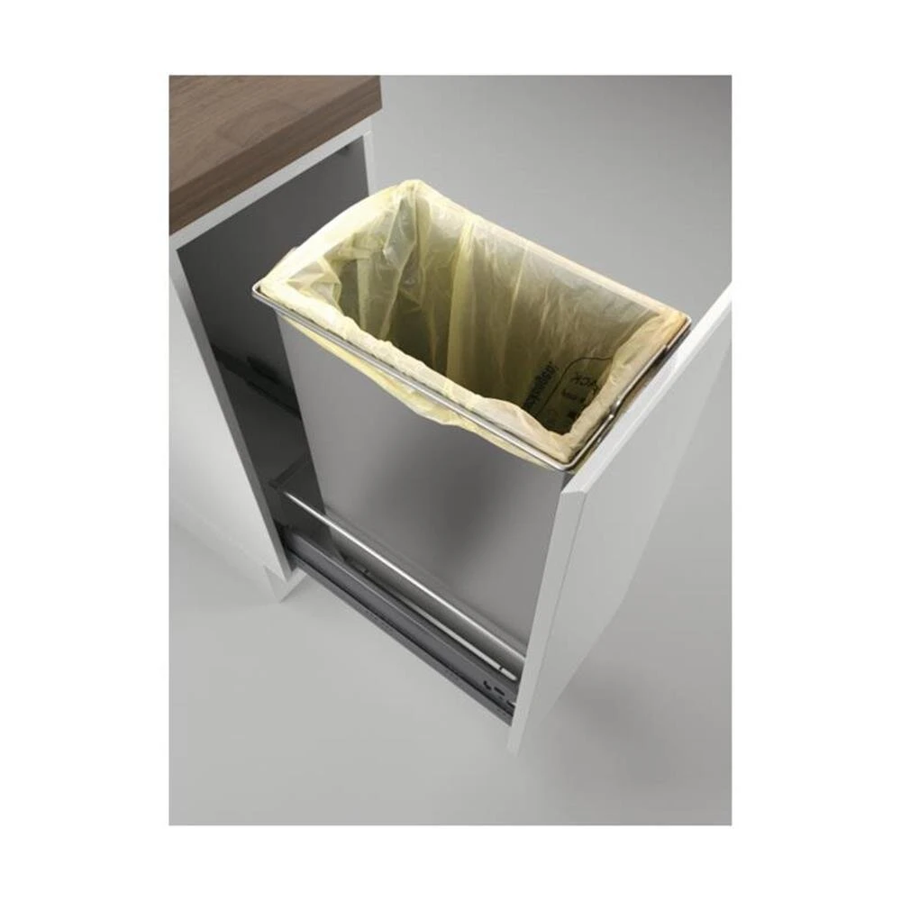Er lässt den gelben Sack elegant und unsichtbar hinter der Front verschwinden. Ein integrierter Klemmbügel fixiert den Beutel. Die Auffangschale unterhalb es Sacks sorgt dafür, dass im Fall der Fälle keine Flüssigkeiten in den Korpus gelangen. Der integrierte Metalldeckel minimiert die Geruchsentwicklung