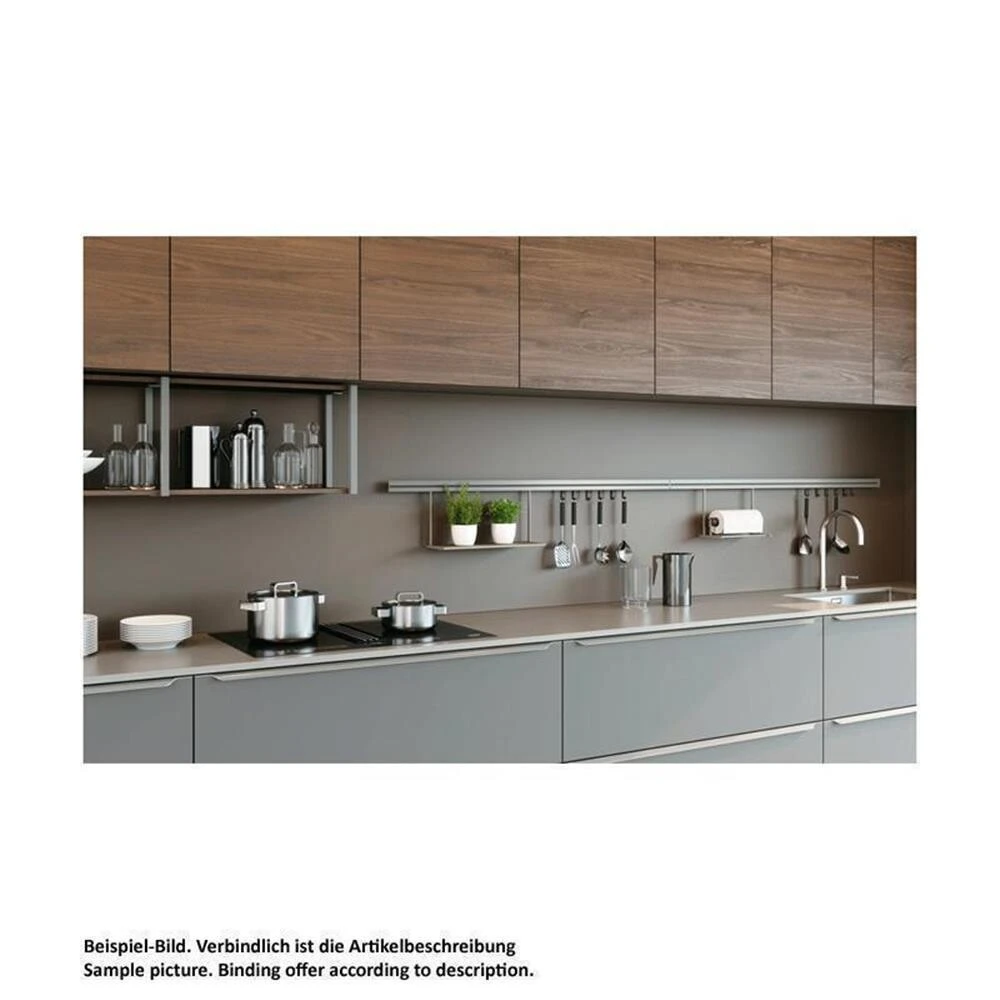Das Aurora Relingsystem wertet die Küche durch sein einzigartiges Design auf. Die optionale LED-Beleuchtung akzentuiert diesen Küchenbereich eindrucksvoll. Die optionalen Zubehörteile werden durch einfaches Einhängen in die Reling sicher fixiert.