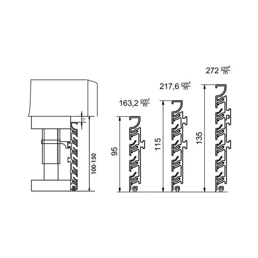 - Lüftungsquerschnitt pro lfm ca. 163 cm² (bei Sockelhöhe 100 mm), 218 cm² (bei Sockelhöhe 125 mm) oder 272 cm² (bei Sockelhöhe 150 mm)