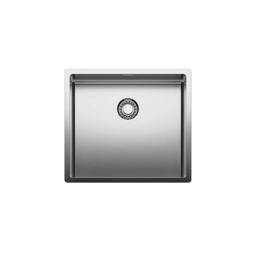 Einzelbecken. 3½“ Ab- und Überlaufgarnitur mit bodenbündigem Siebkorbventil. Bei Verwendung der mitgelieferten Befestigungsklammern vergrößert sich die benötigte Einbaubreite je Seite um ca. 30 mm bei der Unterbauspüle. Flacher Rand: auch geeignet für den flächenbündigen Einbau.