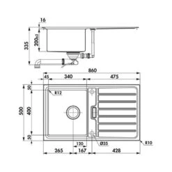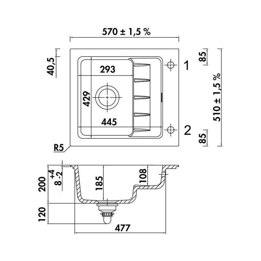 - Spülenmaß: 570 x 510 mm R5 (evtl. + 1.5% Abweichungen)