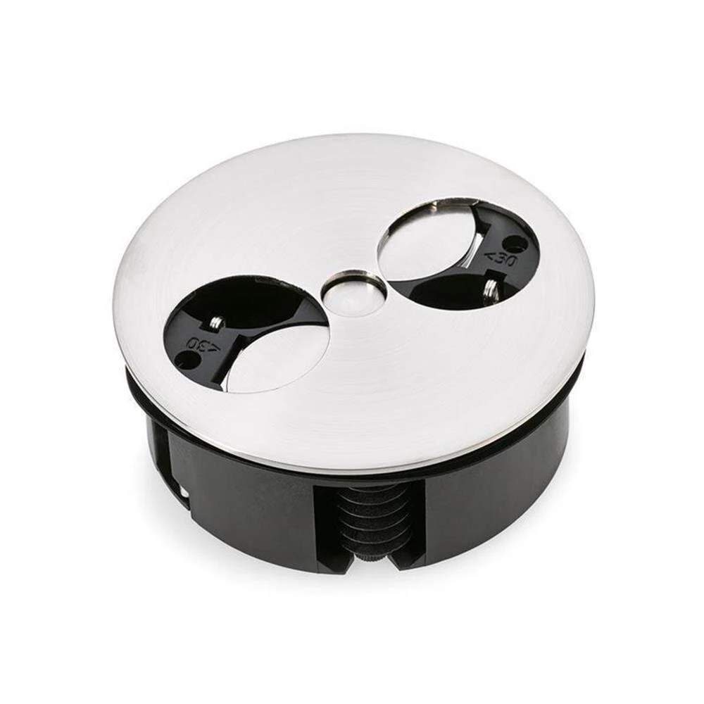 Naber Con-Aktiv | Twist Doppelsteckdose – mit belg./franz. Steckdosen Die Doppelsteckdose eignet sich für den Einbau in Küchenarbeitsplatten aus Holz, Schichtstoff, Naturstein oder Glas. Durch Verdrehen der Abdeckung um 90 Grad wird der Zugang zu zwei Schutzkontaktsteckdosen ermöglicht, die eine komfortable und sichere Stromzufuhr bieten. Die Fixierung erfolgt über zwei montierte Zylinderkopfschrauben mit Innensechskant M6. Die Kabelführung ist unten oder zur Seite möglich. 1,5 mm² schwarz Aderendülsen. Kunststoffgehäuse mit Abdeckung aus Zinkdruckguss vernickelt, edelstahlfarbig gebürstet.