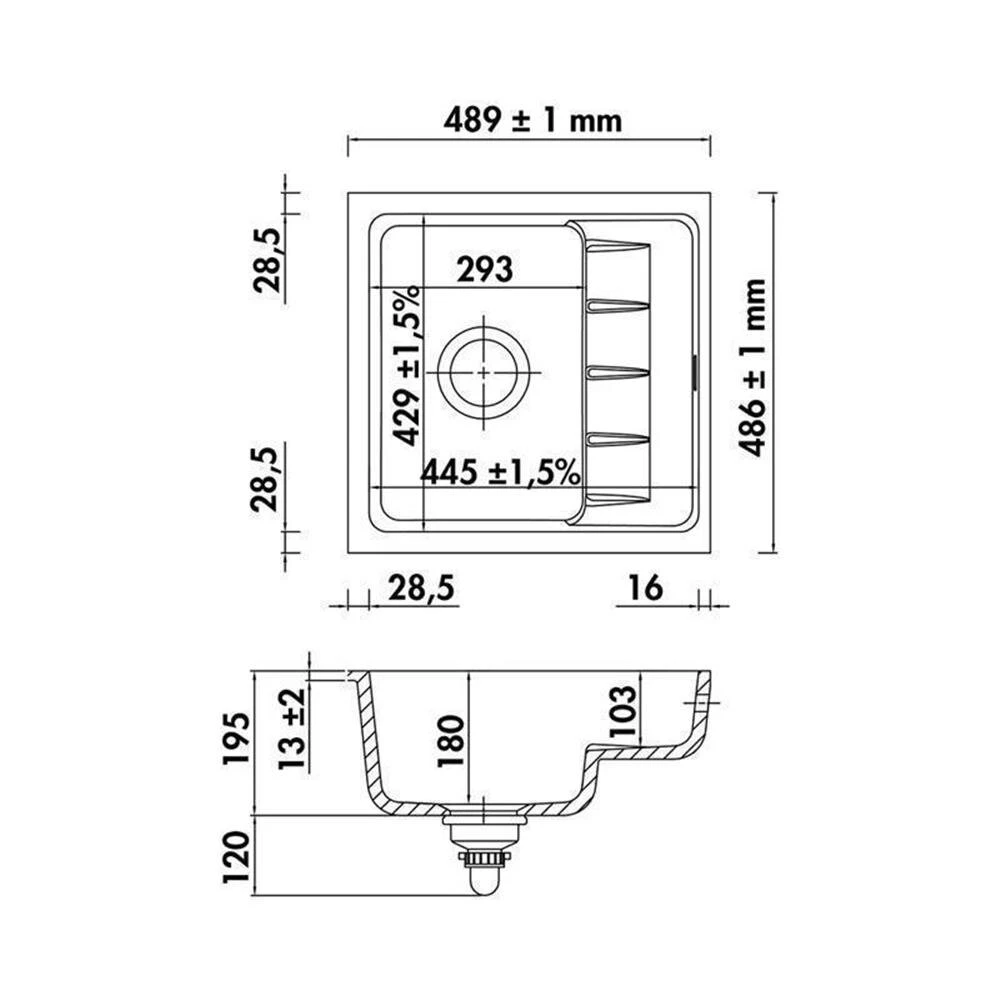 (wird die Unterbauspüle geklebt, können dünnere Arbeitsplatten verwendet werden) - Spülenmaß: 489 x 486 mm (+- 1 mm Toleranz)
