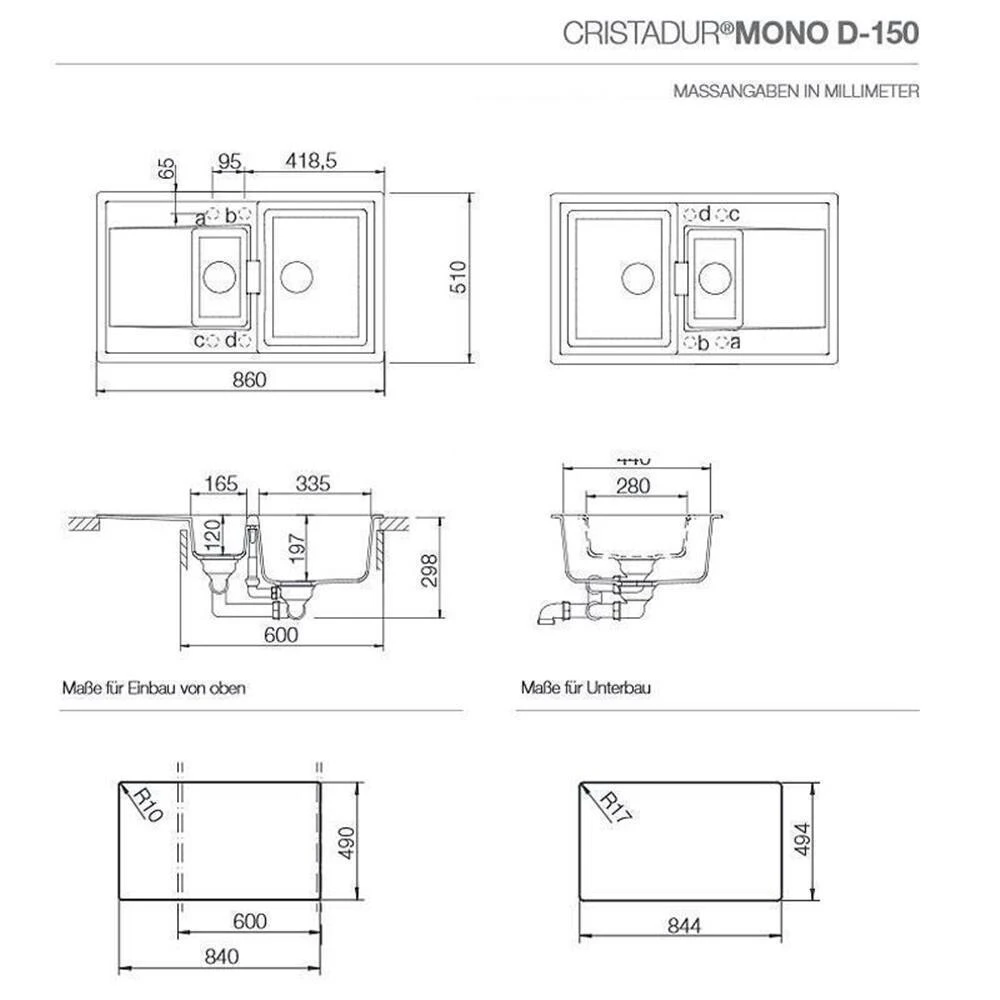 - Spülenmaß: B 860 x T 510 mm