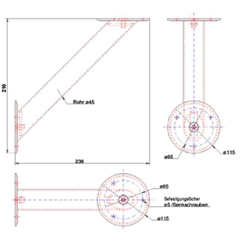 - Befestigungs-Plattform an den Enden 115 mm Durchmesser, jeweils mit 3