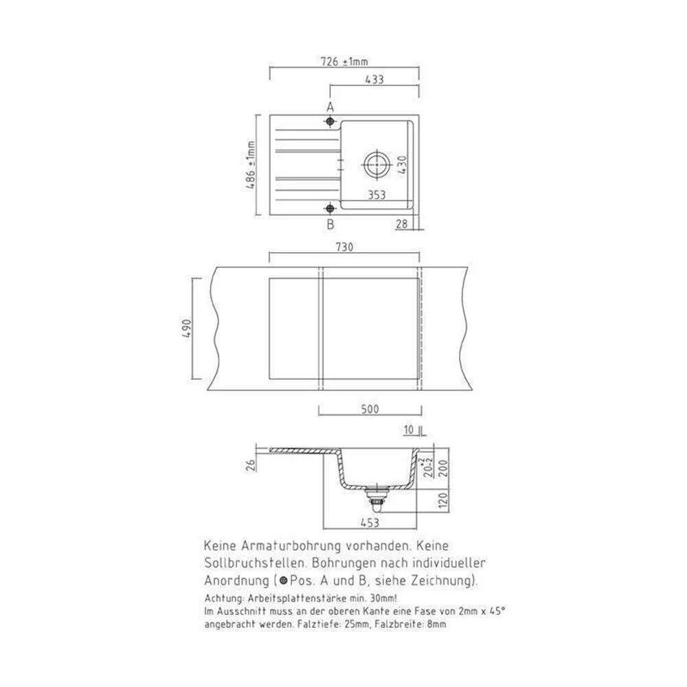 - die Spülen-Randstärke kann von 20 mm auf 10 mm reduziert werden. Falztiefe dann 15 mm / Mindest-Arbeitsplattenstärke 20 mm. Dazu Artikel 9055 (Hersteller-Artikelnummer) bestellen. Beachten Sie dabei bitte die Einschränkungen speziell für Spülen mit Abtropffläche