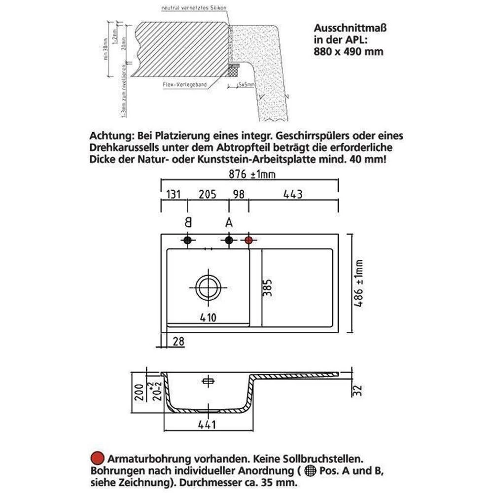 - Spülenmaß: B 876 x T 486 mm