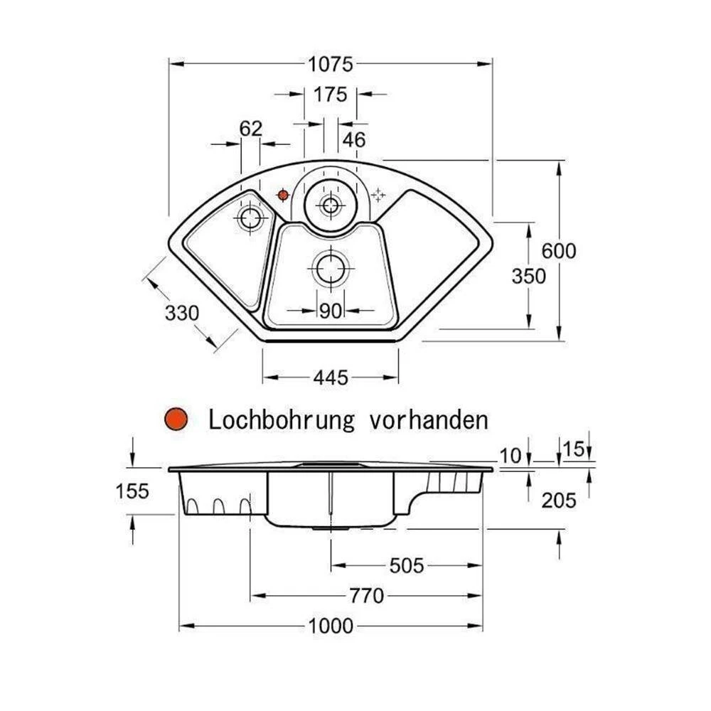 - Zusätzliche Bohrung, zum Beispiel für Spülmittelspender möglich (beachten Sie hierzu die Skizze mit der möglichen weiteren Bohrung)