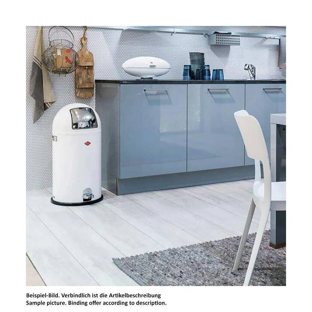 Klassisches Design ergänzt um den praktischen Fußtritt, durch den die Klappe geöffnet wird. Korpus aus hochwertigem Stahlblech, Klappe Edelstahl, Einsatz Metall.